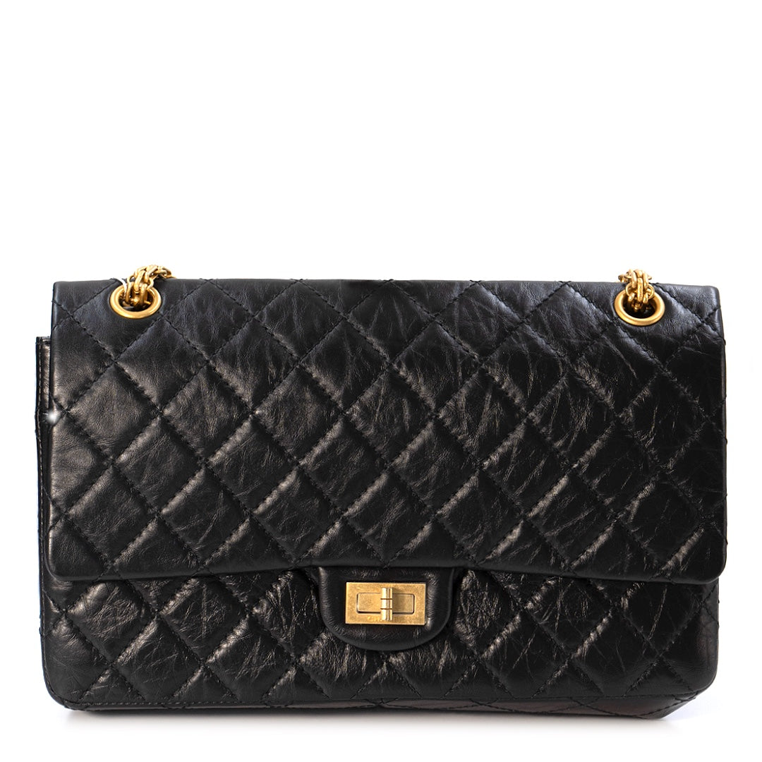 The Chanel 2.55 Handbag in Black Aged Calfskin with Gold-Tone Metal Hardware is a timeless icon of elegance and luxury craftsmanship. Expertly crafted from supple, aged black calfskin leather, this piece combines durability with a soft, polished finish, offering both structure and sophistication.