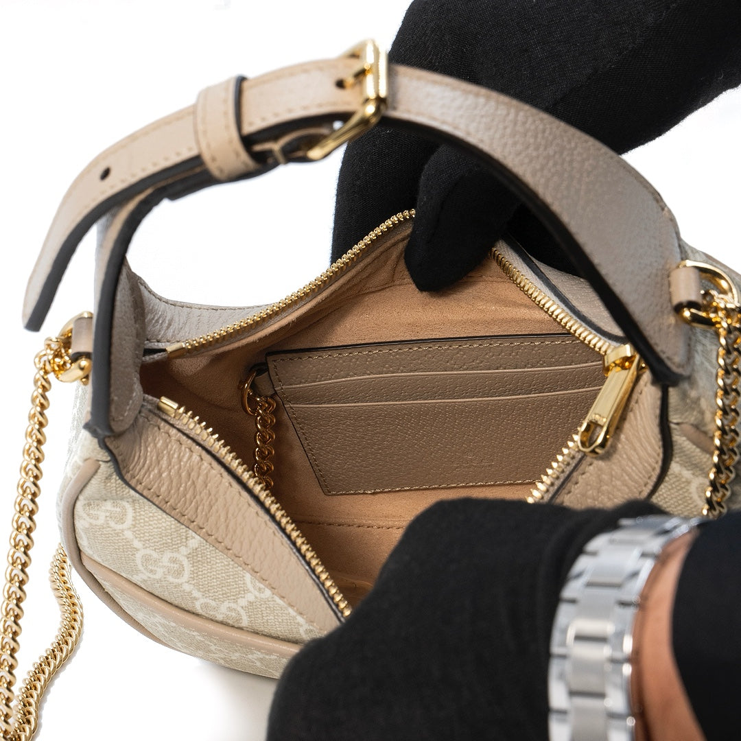 Defined by its elegant half-moon silhouette, the bag features a secure zip-top closure and polished hardware, reflecting Gucci’s commitment to functional luxury. Despite its compact mini size, the interior is thoughtfully designed to accommodate daily essentials while maintaining a sleek and modern profile.