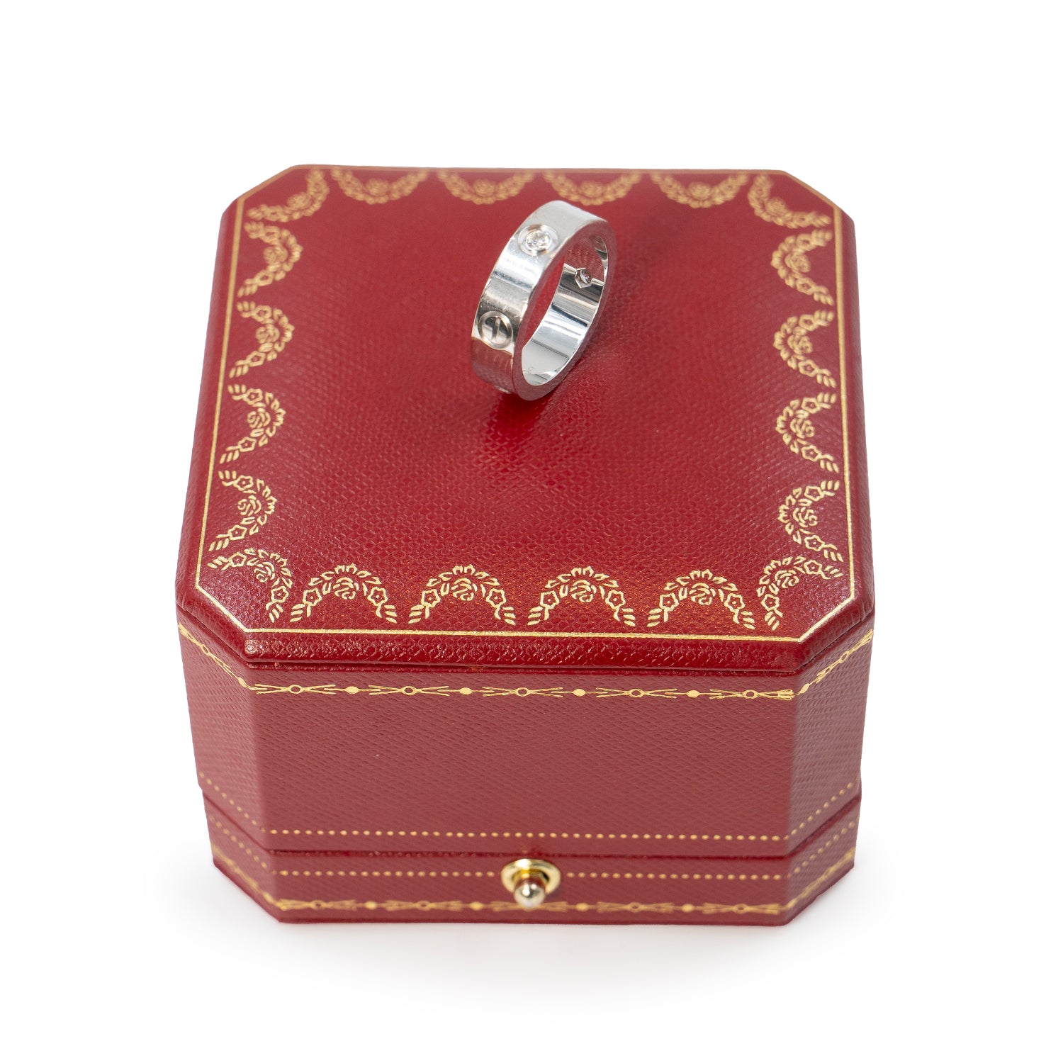 Celebrate timeless elegance with the Cartier Love Ring Classic Model, exquisitely crafted in 18K white gold. This iconic piece features three brilliant-cut diamonds delicately set into the band, symbolizing love and commitment.