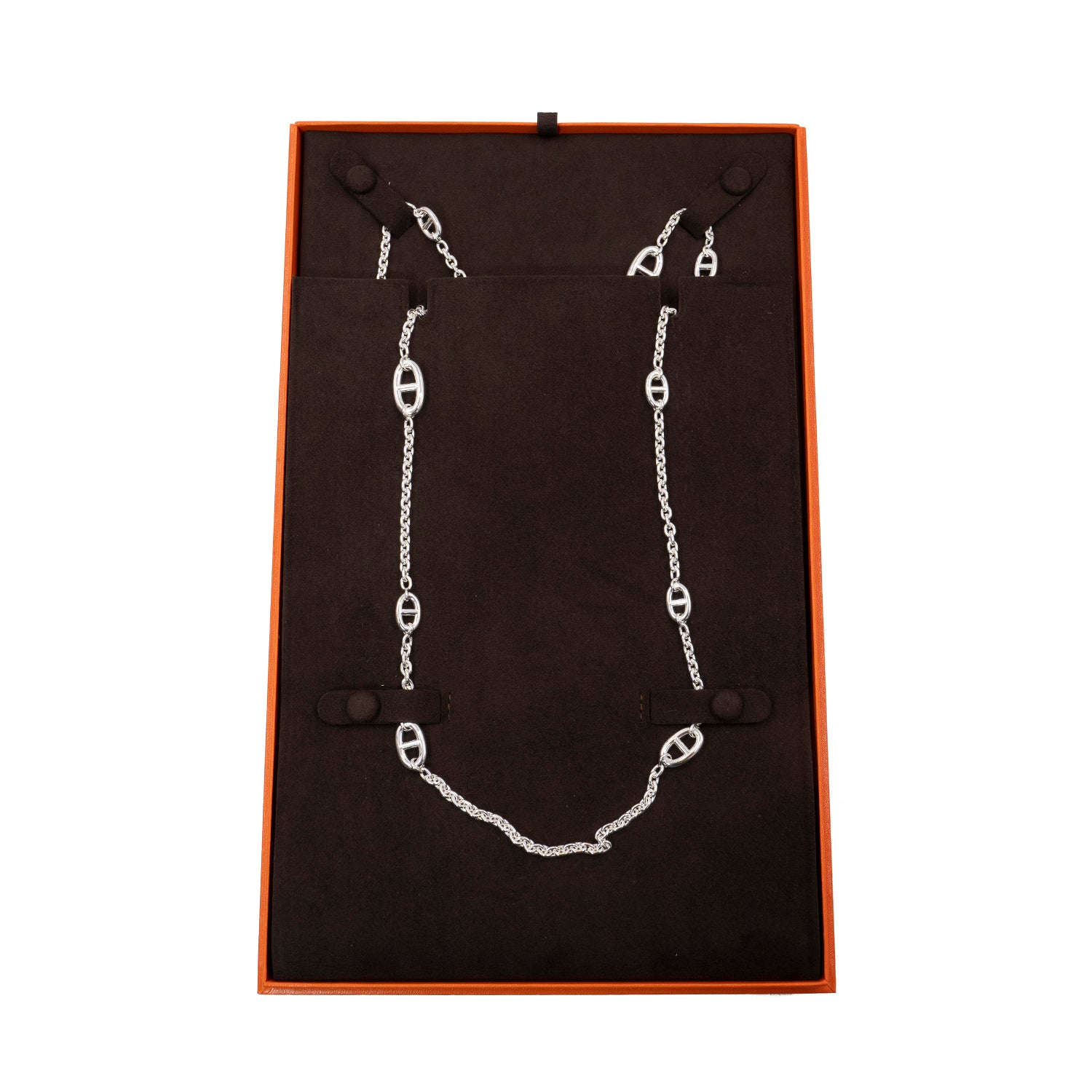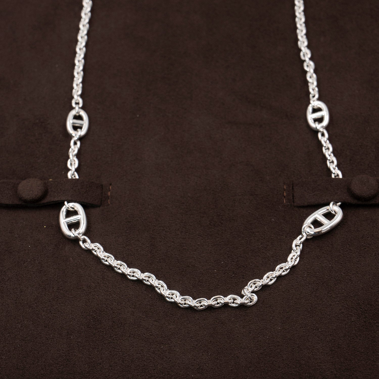 The Hermès Farandole Sautoir 160 Necklace is a timeless jewelry piece that reflects the house’s signature elegance and craftsmanship. Beautifully crafted in sterling silver (AG925), this long sautoir necklace features an intricate series of Hermès’ iconic “Chaîne d’Ancre” (anchor chain) links, symbolizing strength and sophistication.