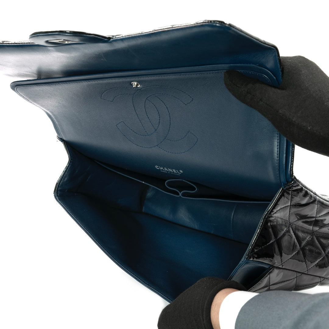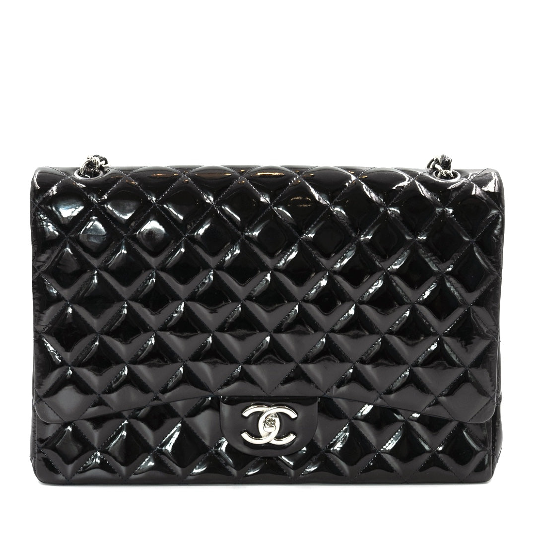 Chanel Black Maxi Classic Double Flap Bag in Patent Leather with Silver Tone Hardware